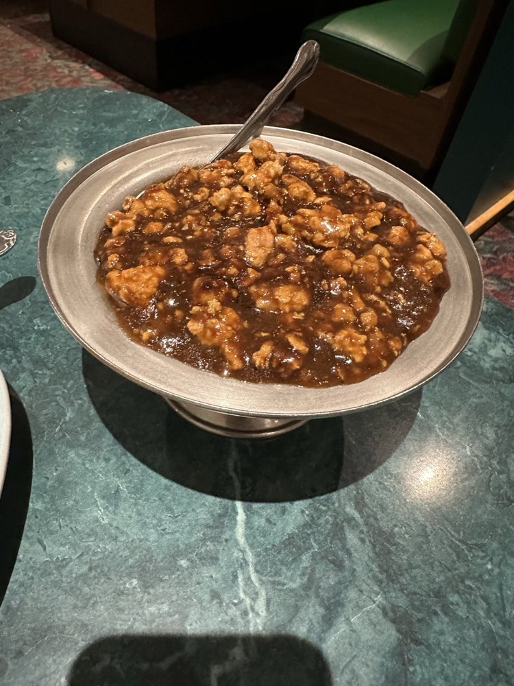 Slices of chicken sauteed with mushrooms in a spicy black bean sauce